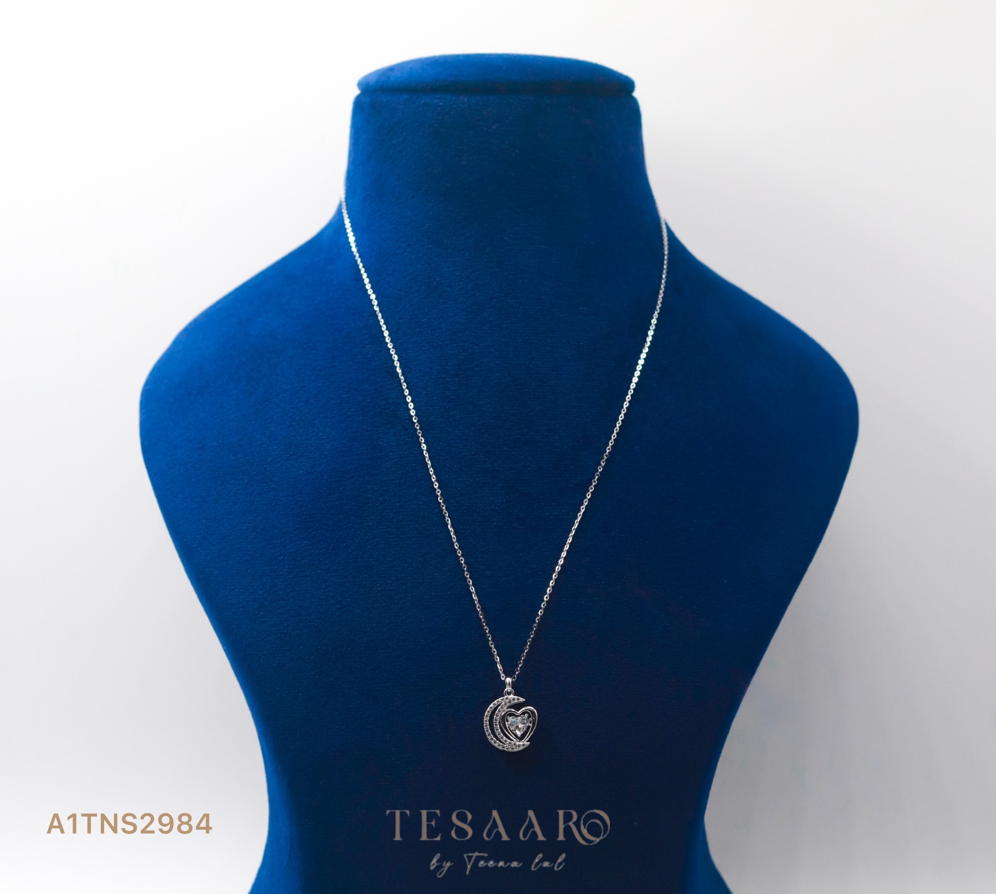 A stunning 92.5 silver metal, gold-plated necklace featuring a heart enclosed within a crescent design, symbolizing everlasting love and refined elegance.