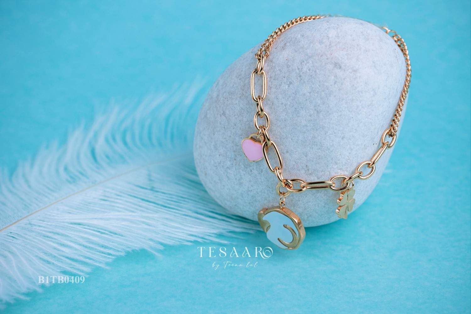 A premium jewellery statement from Tesaaro, showcasing a radiant gold link chain adorned with playful charms — including a pink heart, clover, and abstract motif — blending modern chic with a touch of whimsical elegance.