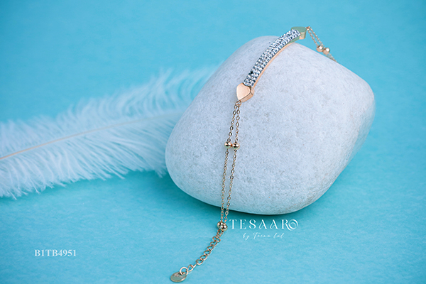 A premium jewellery statement from Tesaaro, featuring a sleek adjustable gold chain bracelet with a heart accent and a row of shimmering crystals — combining elegance, romance, and modern sophistication in one timeless design.