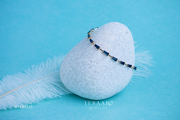 A premium jewellery statement from Tesaaro, featuring a line of deep blue baguette-cut stones set in a refined gold chain — exuding sophistication and timeless allure perfect for evening elegance.