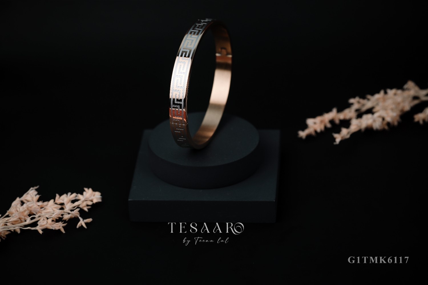 A striking metal bangle featuring a bold Greek key motif in contrasting tones for a modern yet timeless appeal. Its refined detailing and polished finish make it an elegant accessory suitable for both everyday wear and special occasions. A standout piece from Tesaaro.