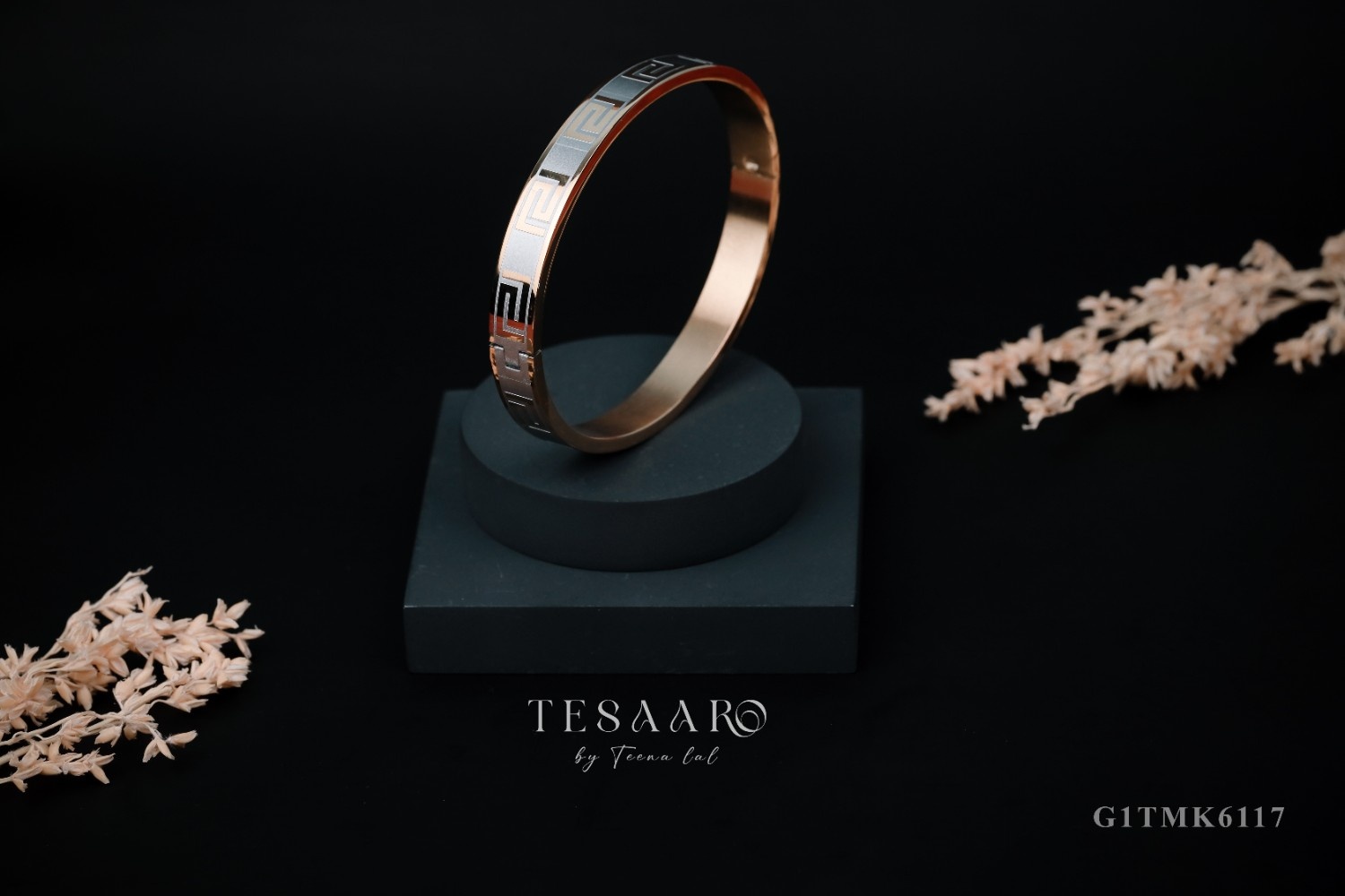 A refined metal bangle showcasing the timeless Greek key pattern in a dual-tone finish. Its sleek and elegant design adds a touch of sophistication, making it perfect for everyday wear or special occasions. A stylish statement piece from Tesaaro.