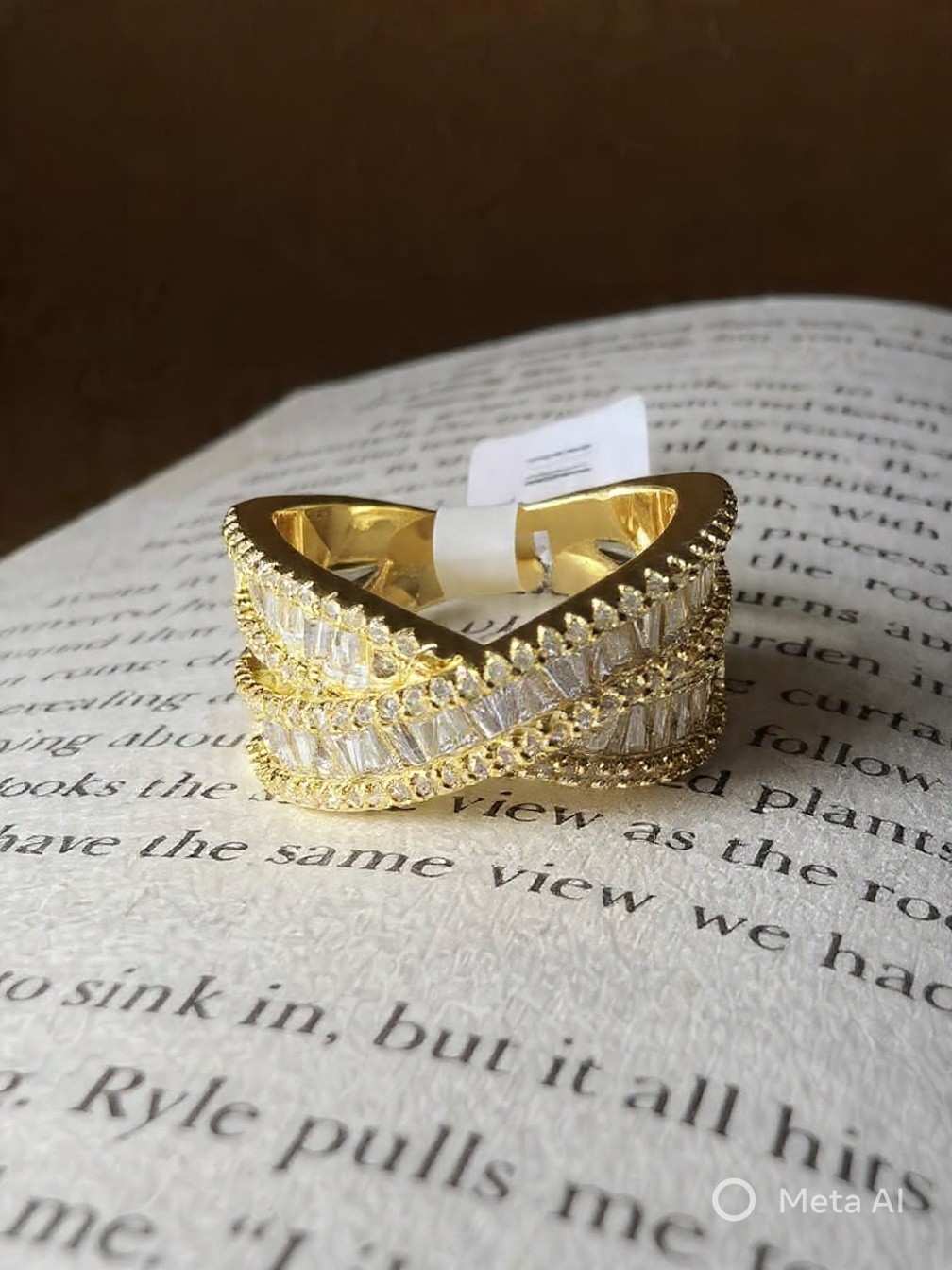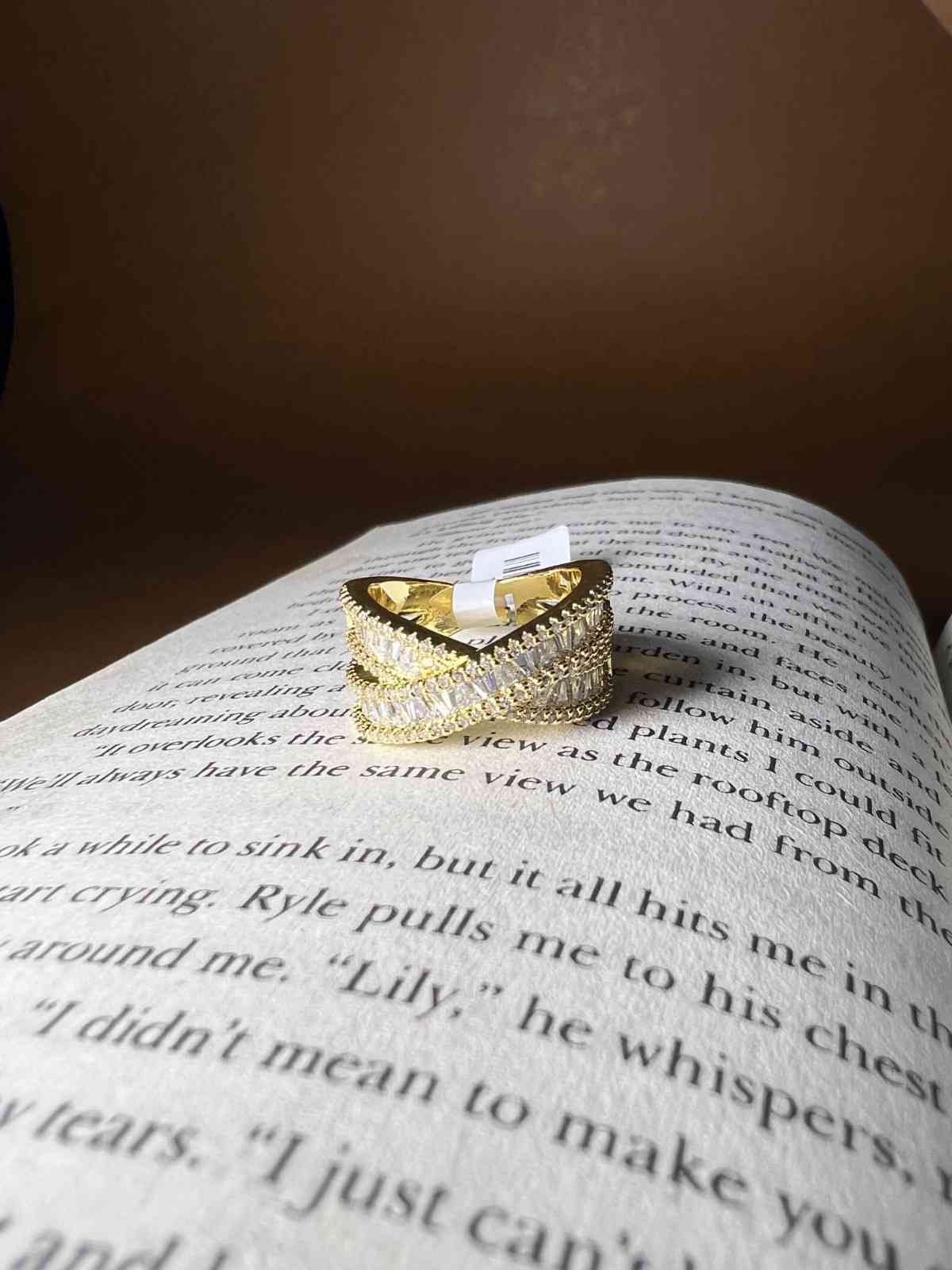 Modern gold-tone statement ring with layered crystal sparkle, perfect for party and evening wear.