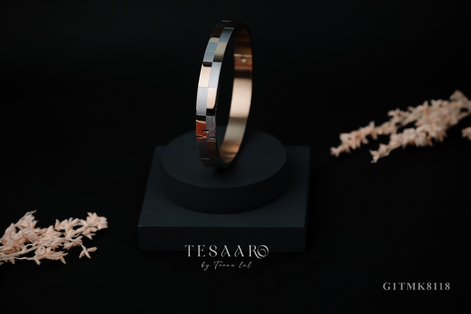 A modern and stylish bangle featuring a sleek block-pattern design in contrasting dual tones. Its polished finish and contemporary geometric detailing make it a versatile accessory that adds sophistication to any look. Perfect for both casual and formal wear.