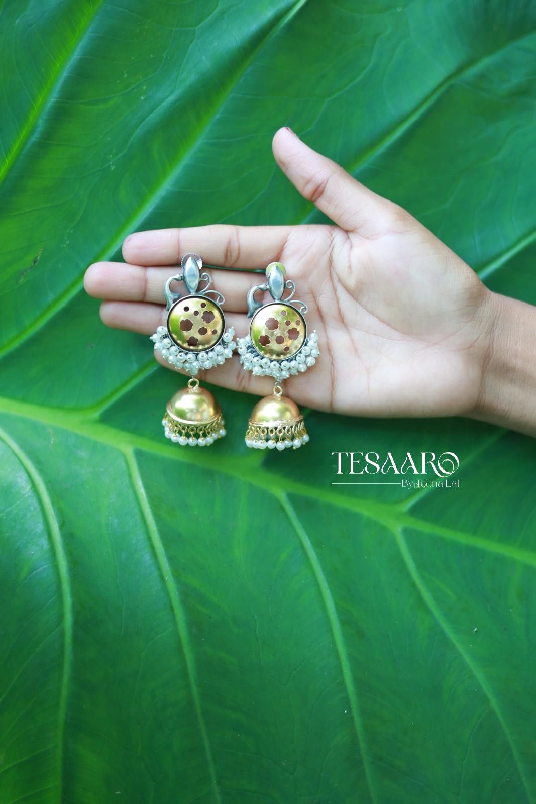 Brass silver–replica dual-tone earrings featuring floral cutwork tops, pearl detailing, and golden jhumka drops—elegant, festive, and perfect for ethnic styling