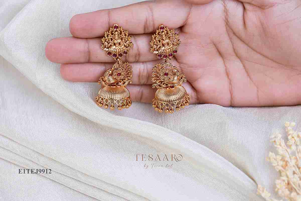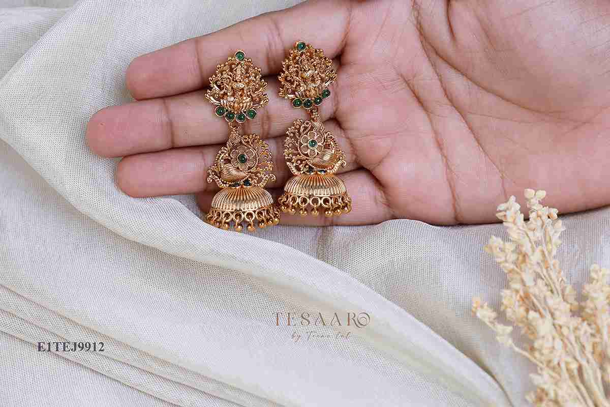 Magnificent gold-toned jhumka earrings featuring detailed peacock motifs, temple-inspired carvings, and green stone embellishments — a true symbol of regal beauty and tradition.