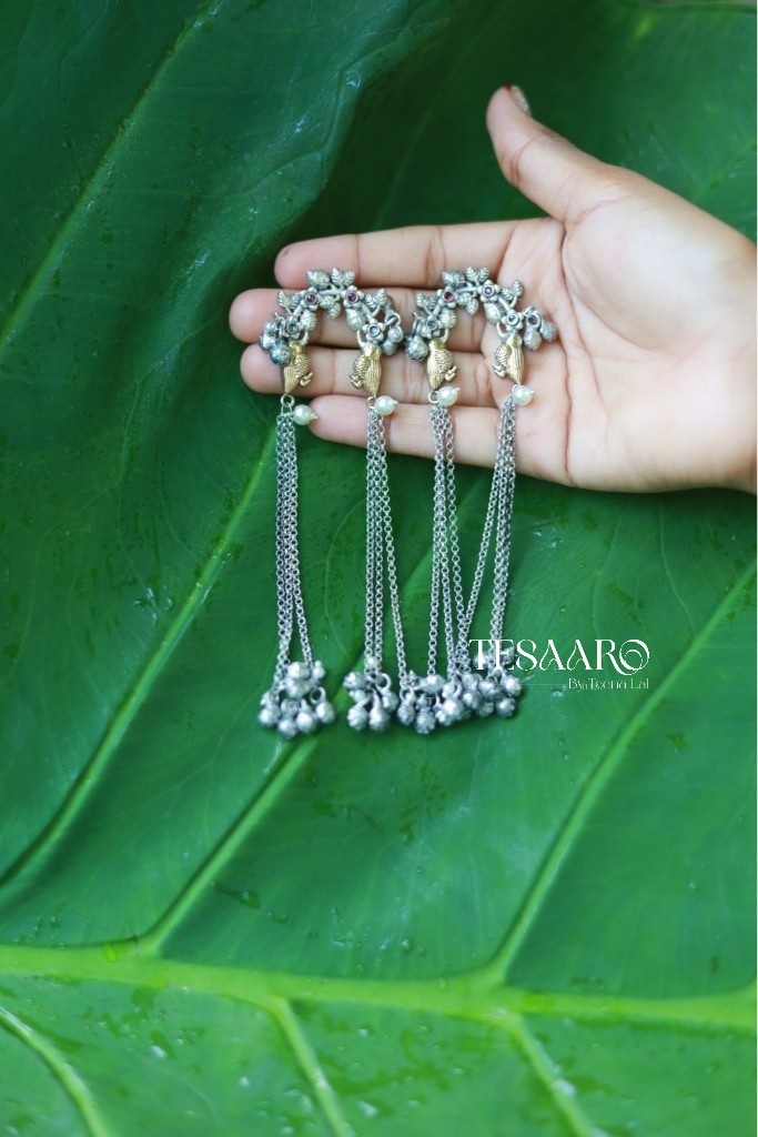 Brass silver–replica Kashmiri temple earrings featuring floral detailing, dual-tone motifs, and long chain drops with tiny ghungroo accents—lightweight, ethnic, and perfect for festive styling.