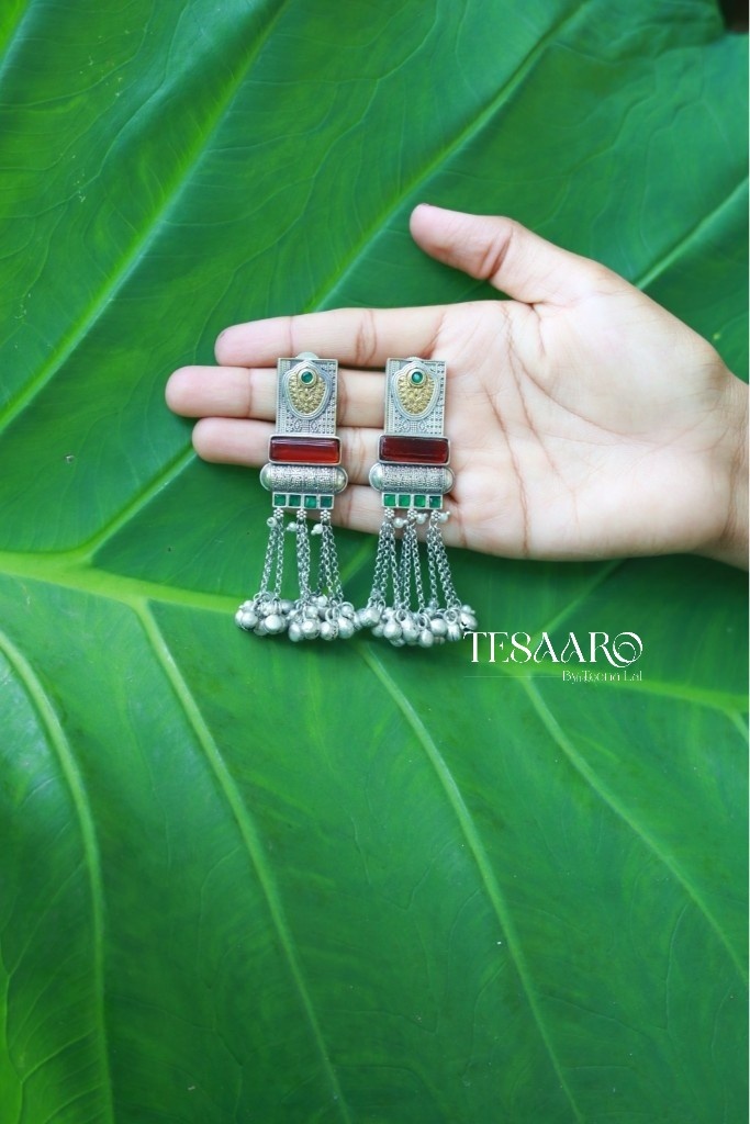 Brass silver–replica Kashmiri tribal earrings featuring engraved rectangular tops, dual-tone detailing, colored stone accents, and multiple chain drops with ghungroos—bold, ethnic, and perfect for traditional styling.