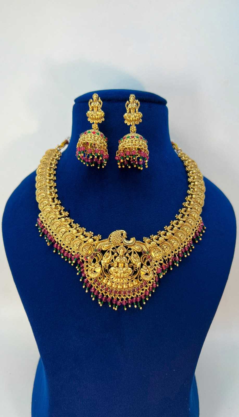 Kerala traditional kasu choker necklace with Lakshmi Devi pendant and matching jhumka earrings, perfect for bridal and temple wear.