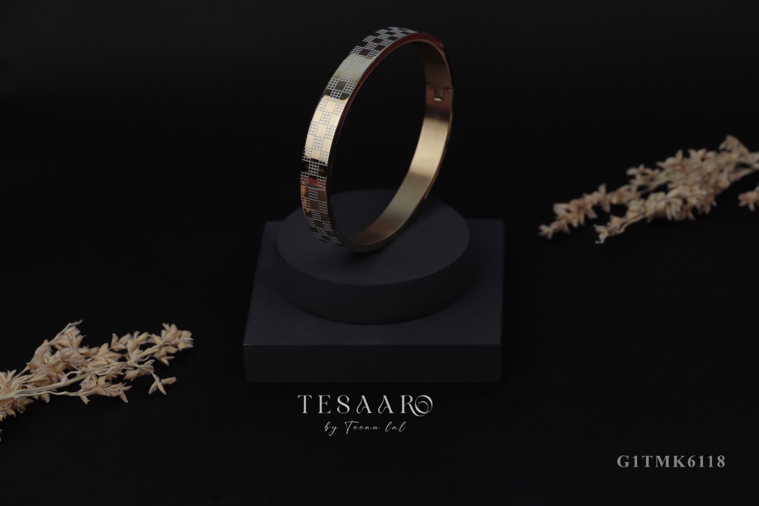 A stylish mosaic-inspired bangle featuring an intricate grid pattern with subtle dual-tone accents. Its modern and artistic design makes it a standout accessory, perfect for elevating both casual and formal looks. A beautifully crafted piece from Tesaaro.