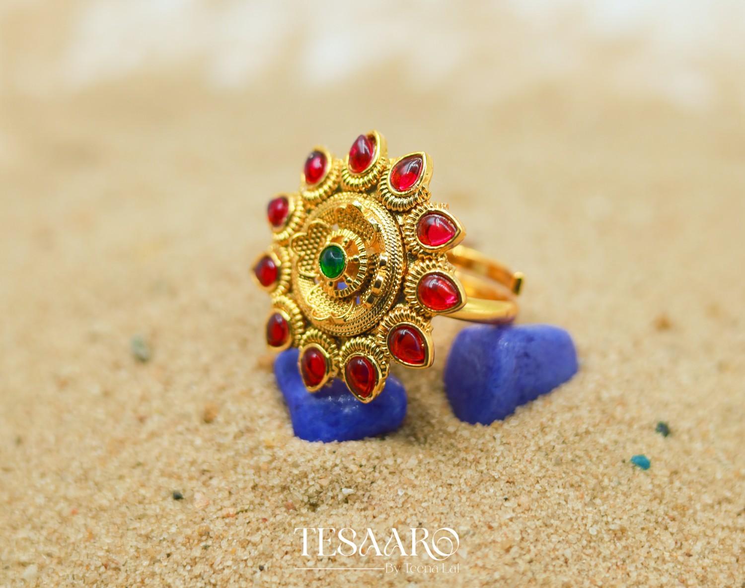 A beautifully crafted statement ring with an ornate gold-tone finish, featuring a striking central green stone surrounded by a floral arrangement of vibrant red teardrop stones. Intricate traditional detailing enhances its regal appeal, making it perfect for festive looks, cultural celebrations, and elegant ethnic wear.
