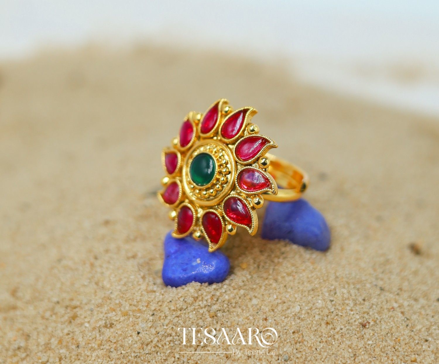 A beautifully crafted statement ring with an ornate gold-tone finish, featuring a striking central green stone surrounded by a floral arrangement of vibrant red teardrop stones. Intricate traditional detailing enhances its regal appeal, making it perfect for festive looks, cultural celebrations, and elegant ethnic wear.