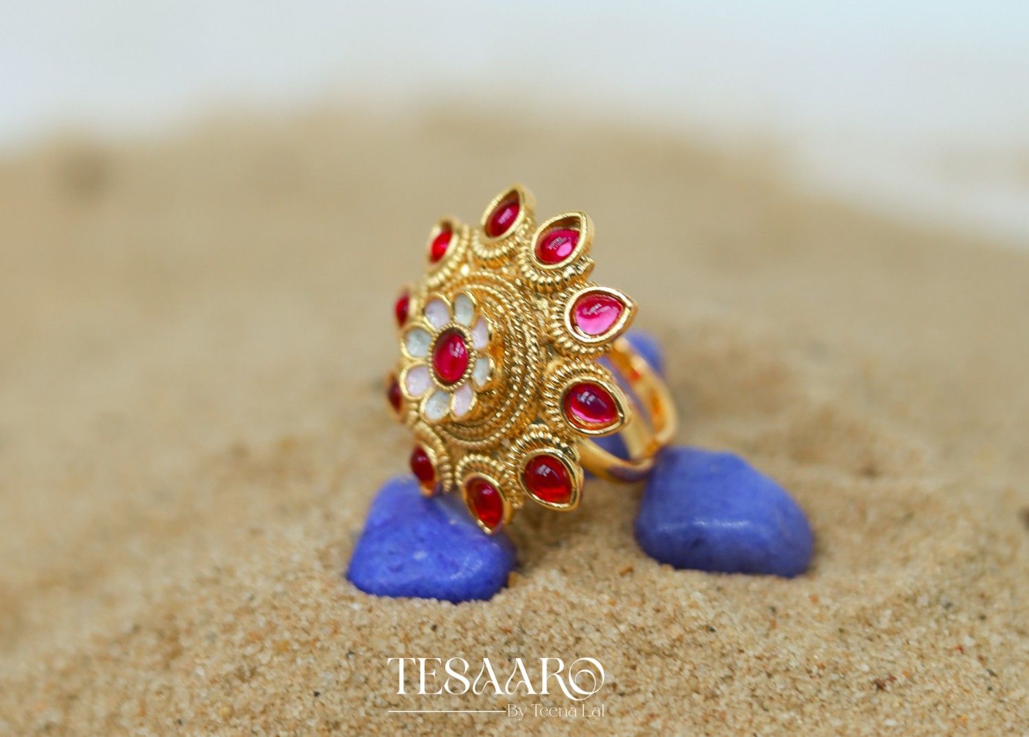 A stunning statement ring crafted in a rich gold-tone finish, featuring intricate traditional detailing. The centerpiece is surrounded by brilliant red teardrop stones and delicate kundan-style accents, creating a luxurious floral-inspired design. Adjustable for a comfortable fit, this piece is perfect for festive wear, weddings, and special occasions.