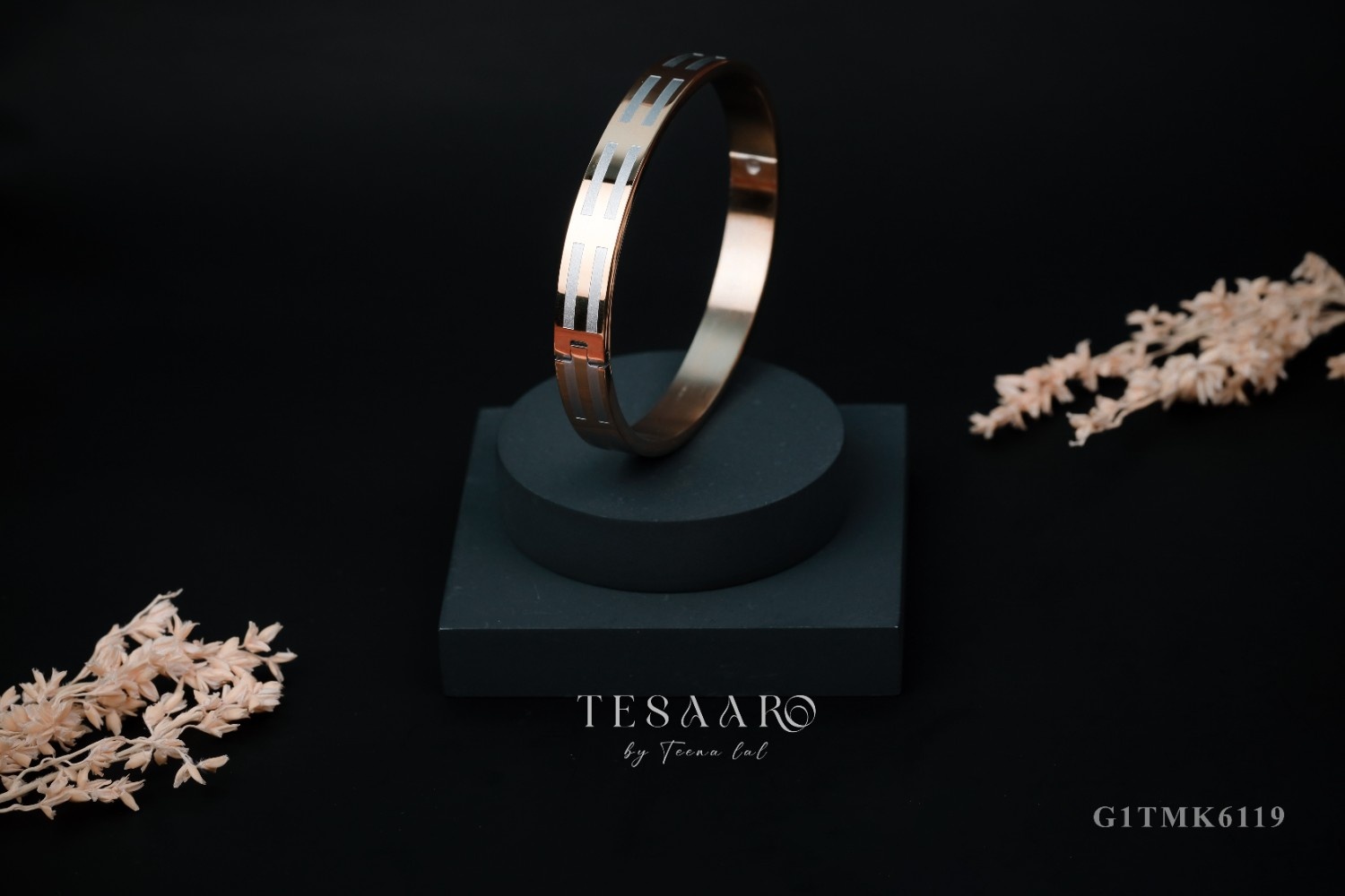 A sleek and modern metal bangle featuring a geometric cut-out pattern with dual-tone detailing. Designed for a contemporary, elegant look, this Tesaaro accessory adds a refined touch to any outfit. Perfect for both casual and formal wear.