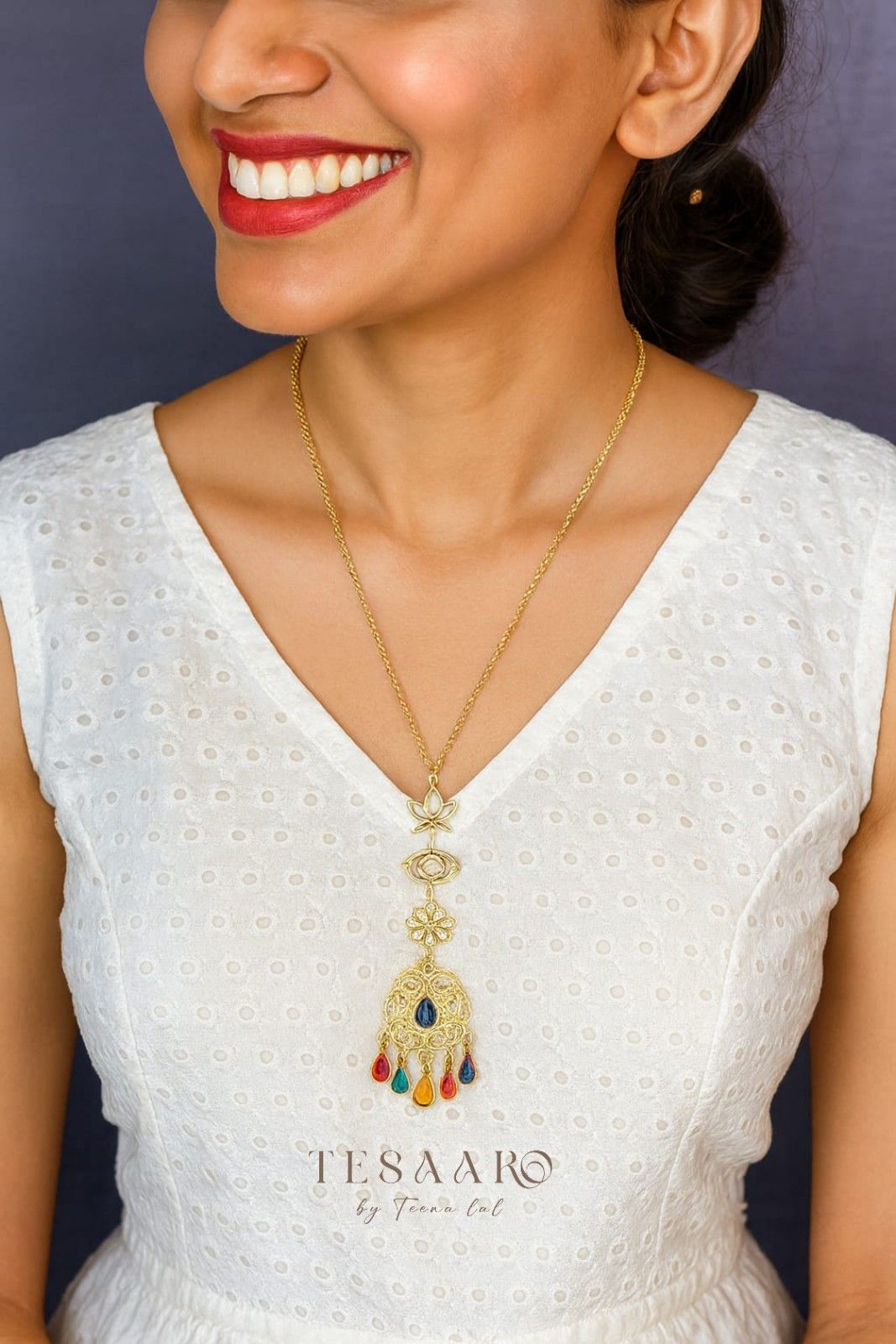 Brass statement necklace featuring intricate motifs and vibrant multicolour stones for a bold, artistic elegance.