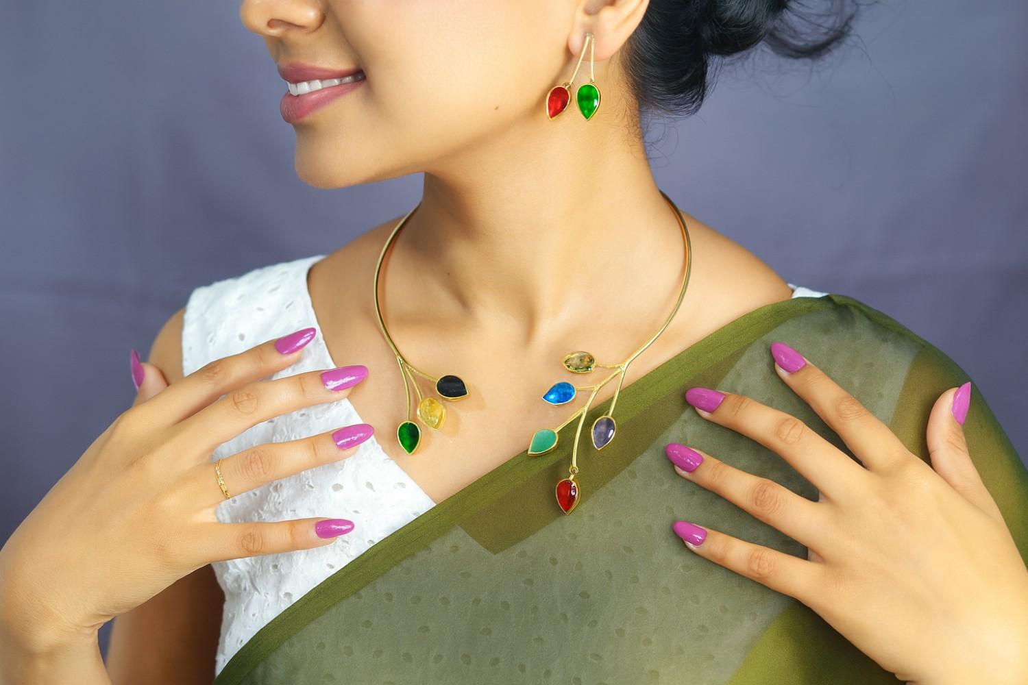 The Tesaaro Premium Brass & Stone Collection features this elegant Rainbow Leaf Necklace Set, crafted in high-quality gold-plated brass. Each leaf pendant is adorned with vibrant, multicolored stones, creating a graceful, nature-inspired design. Paired with matching earrings, this set adds a modern, artistic touch to both ethnic and contemporary outfits—perfect for special occasions or statement styling.