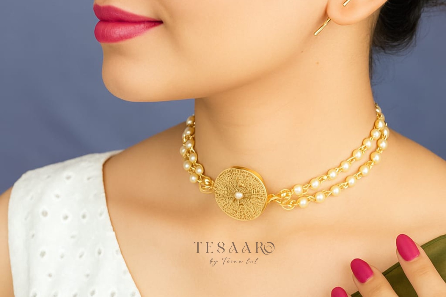 Brass choker embellished with dual pearl strands and an ornate gold medallion for an elegant regal finish.