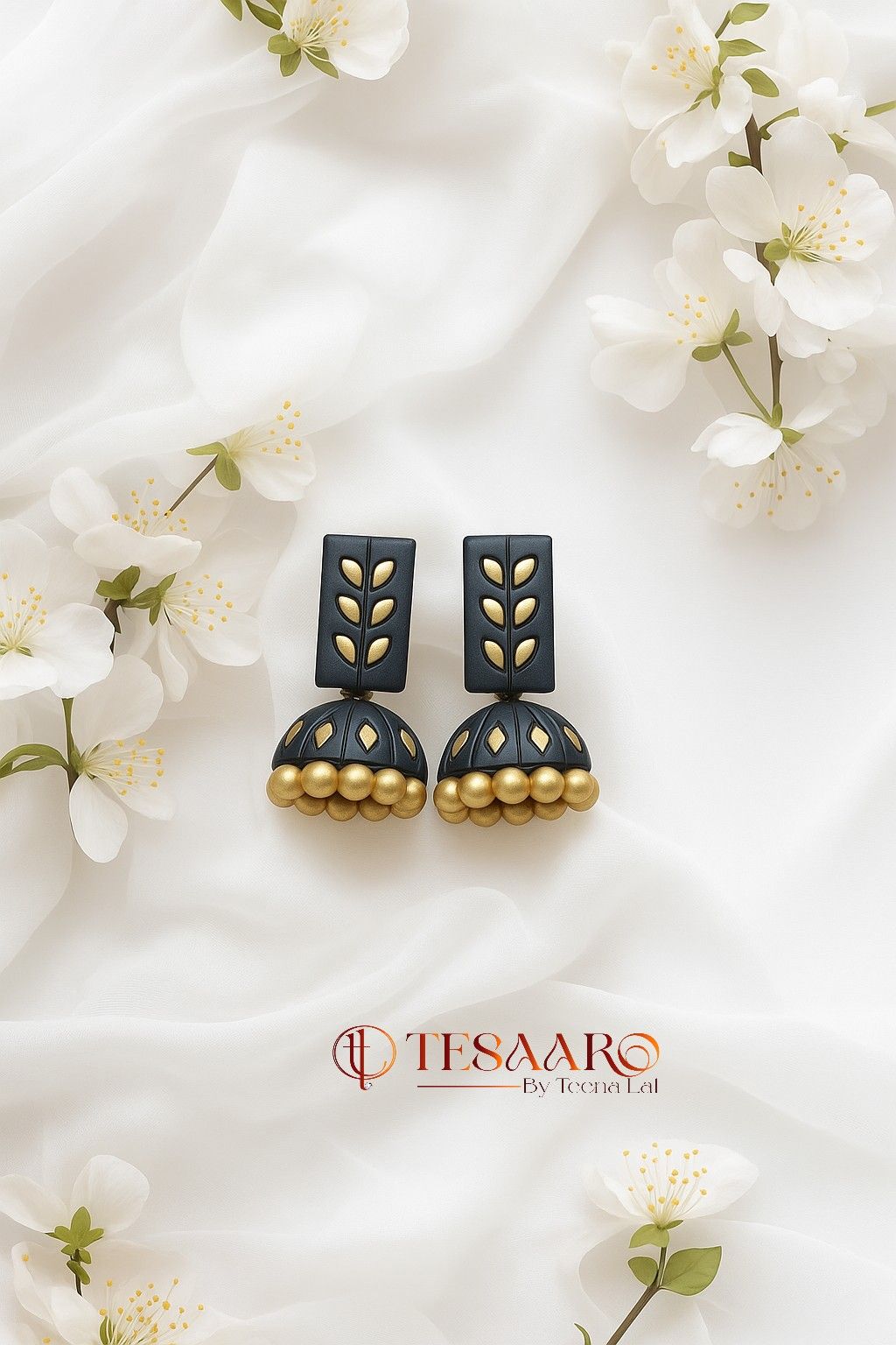 Handcrafted terracotta earrings featuring an elegant black-and-gold design with leaf motifs and dome detailing, perfect for ethnic and contemporary looks.